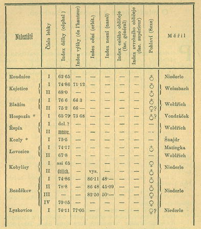 Tabulka indexů hlavních měr lebek z nálozův určitě neolithických aneb aspoň z doby neolithu blízké.