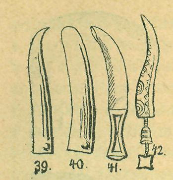Ze bronzové srpy, zvláště ony bez řapíku, jsou jaksi přechodním tvarem od srpů k nožům a v obojím způsobu v užívání byly podobně jako srpovité nože jistých národů (zvláště afrických) dokazuje též velká řada jen nepatrně od sebe se odchylujících tvarů až k oněm skoro úplně rovným, buď špičatým nebo tupým, které rozhodně za nožíky sloužily (obr., 39., 40.5)