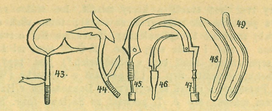 6) Jiný druh házecích přístrojů v podobě srpů s uvnitř nebo na zad ohnutou špičkou jsou dřevěné bumerangy (obr. 48., 49.) v Austrálii, v Indii a v Severní Africe rozšířené.