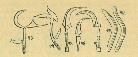 Hlavně ohnutí špičky na zad nelze nijak vysvětliti upotřebením jich při žatí (tu by tato odchylka naopak vadila), ale jest úplně vysvětlitelno z užívání jich při házení. Snad má také zub nebo knoflík na srpech podobný význam jako ozuby házecích nožů afrických; zejména velký zadní osten, jako se nalézá na srpu (obr. 17.) ze Szuszka (Bereg, Uhry.8)