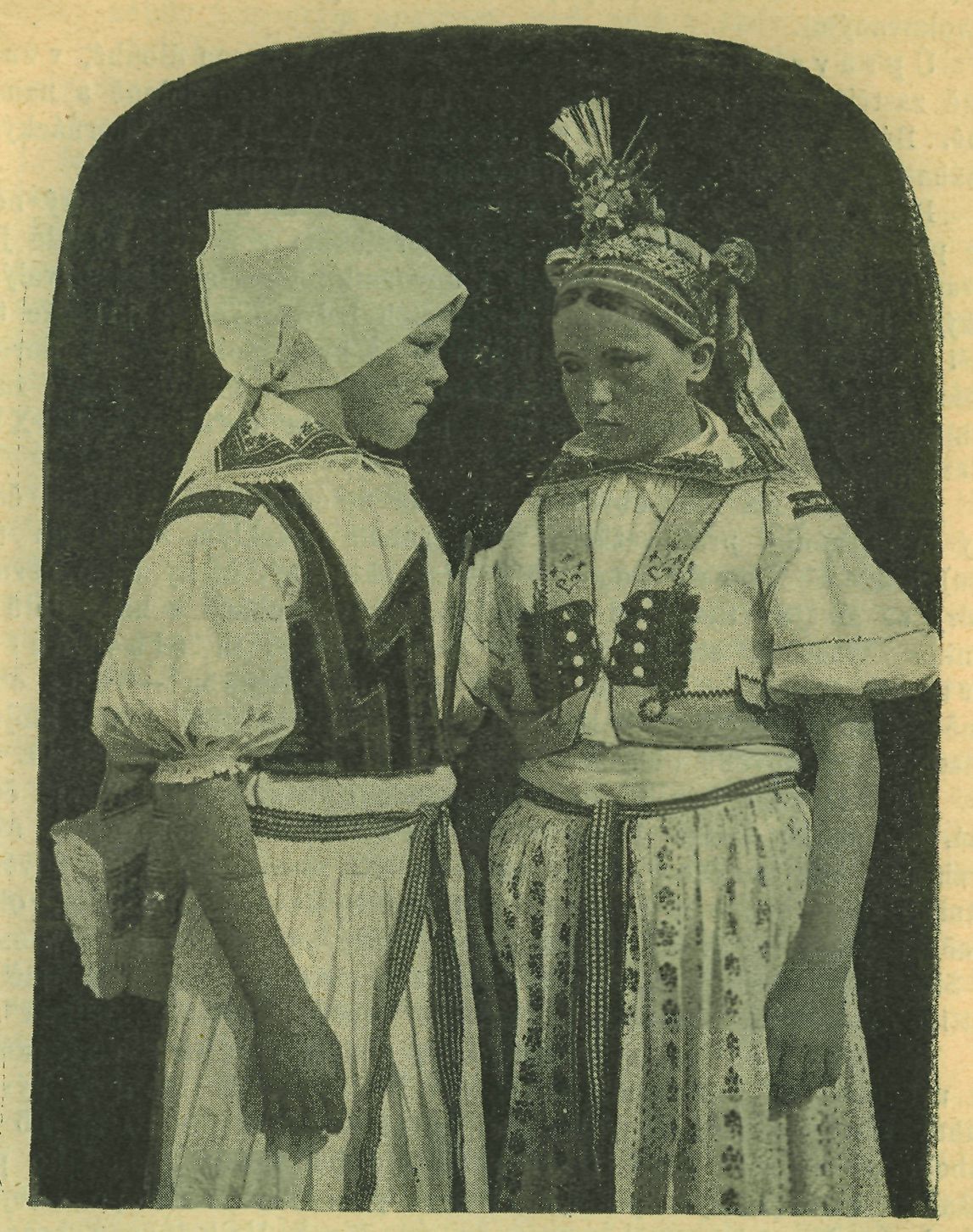 Číš.4. Děvče v šatce a „kabátku" a druhé ve svatebním pentlení. Z Velké. (Fotografie prof. J. K 1 v a n ě.)