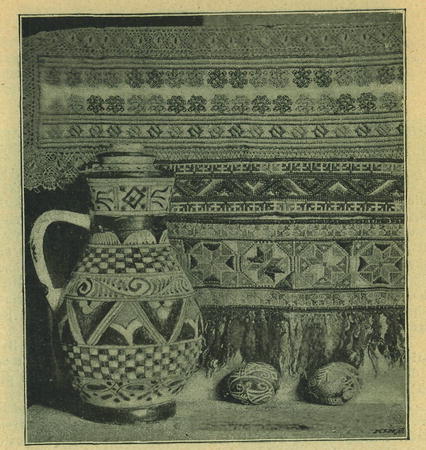 Čís. 6. Konce šatek, „bedněný" (t. j. nahoře až na malý otvor uzavřeny) džbán a kraslice z okolí Velké. (Fotografie professora Jos. K 1 v a n ě.)