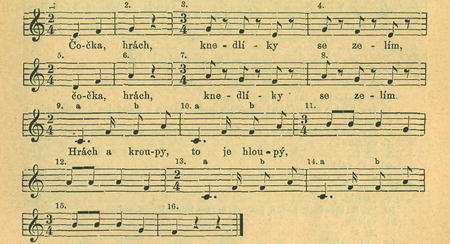 9.—10. na každý z těchto taktů dva kroky s poskokem (a, 6), tanečník počne levou, tanečnice pravou nohou. 11.—12. valčík. 13.—14. — 9. —10. 15.—16. valčík.