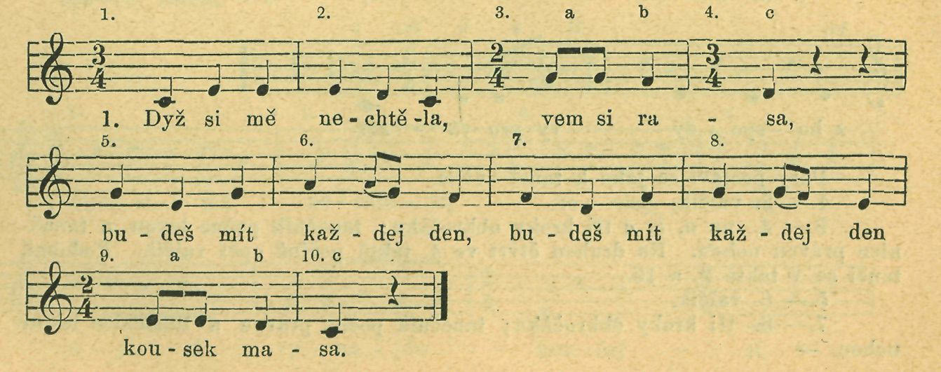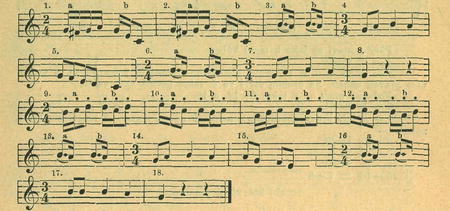 9.—12. osm kroků s poskokem, na každý takt dva (== a, b); tanečník počne levou a tanečnice pravou nohou. 13. dva kroky obkročáku. 14.—-15. valčík. 16.=13. 17.—18. valčík.