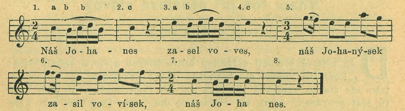 7.—10. osm kroků s poskokem (na takt dva), tanečník počne levou a tanečnice pravou nohou. 11—12. — 1.—2. 13. valčík. 14.—15. = 11. —12. 16. valčík.