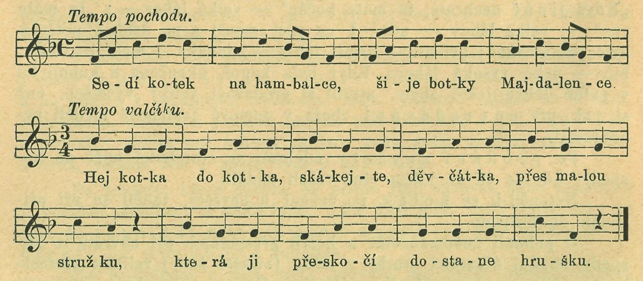 Očepenou nevěstu mladou paňmámou nazývajíce přiváděly ženichovi za zpěvu a fance. Tančily kotka. Svatebnice vezmouce se za ruce (muži málokdy se přimísili) utvořily řetěz, postupujíce sunem a poskokem proplítaly se mezi nábytkem do všech východů obyčejných i nahodilých (do oken), hopkovaly přes dvůr, kolem špejchárku aneb osamocené stodoly, ano i na náves se dostaly, při čemž zpívaly: