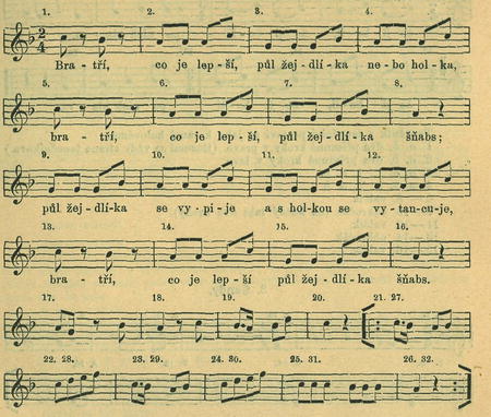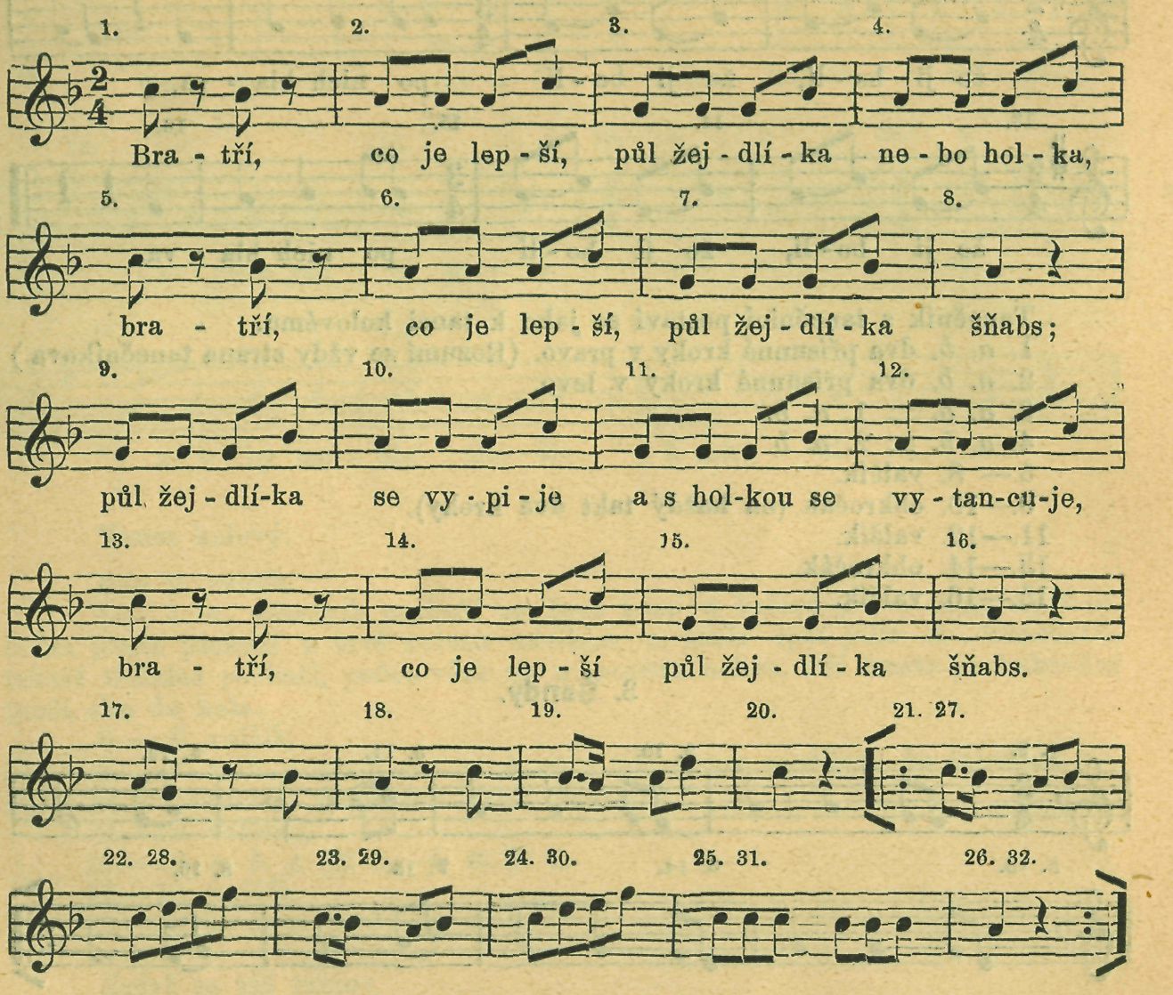 17.—20. stálo za pravice se držíce, tančí „Ěezanku" z Besedy známou, a to tak, že na 17. a 18. takt učiní po jednom krbku, na 19. dva kroky a na 20. poslední krok.