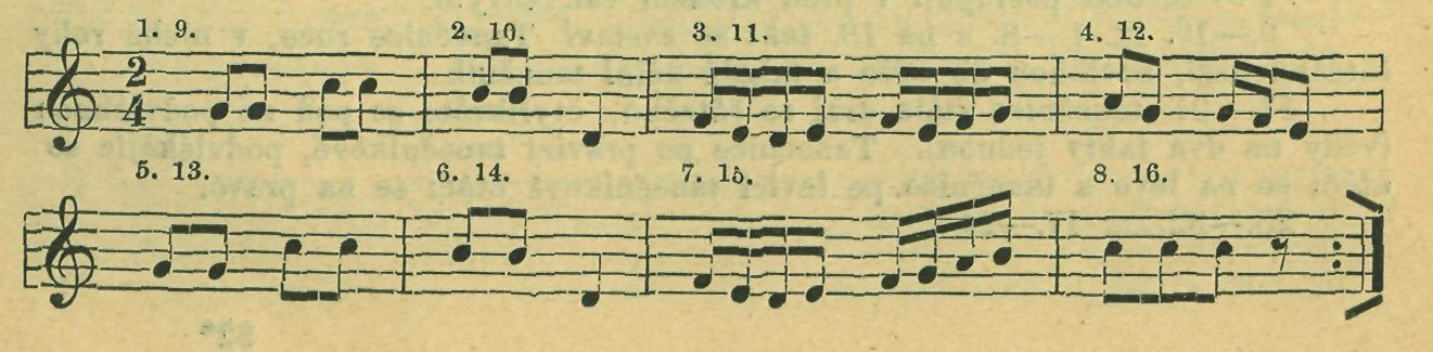 1.—16. tanečnice postaví se před tanečníka tváří v tvář a uchopivše se oba za pravice, tančí postupujíce krokem polkovým, a to tanečník po předu a tanečnice po zpátku. Na první čtvrť 16. taktu učinivše poslední krok, zastaví se tak, aby připraveni byli (nakročeni) ke kroku řezankovému.