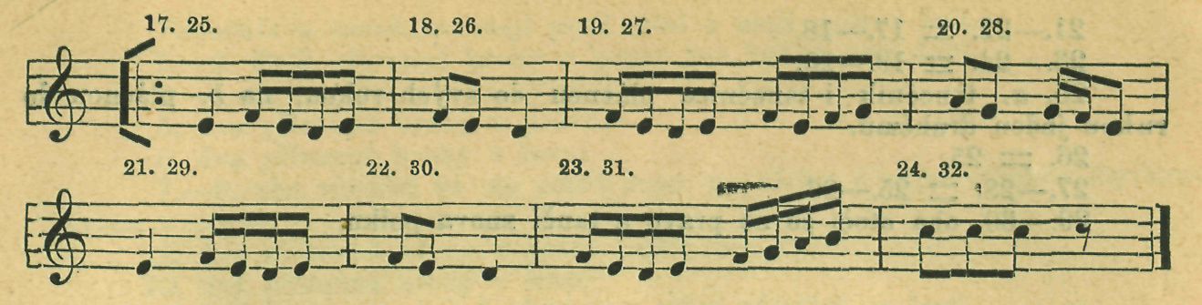 8. třikráte dupnou, vždy jednou nohou střídavě. 9.—16. = 1.—8.