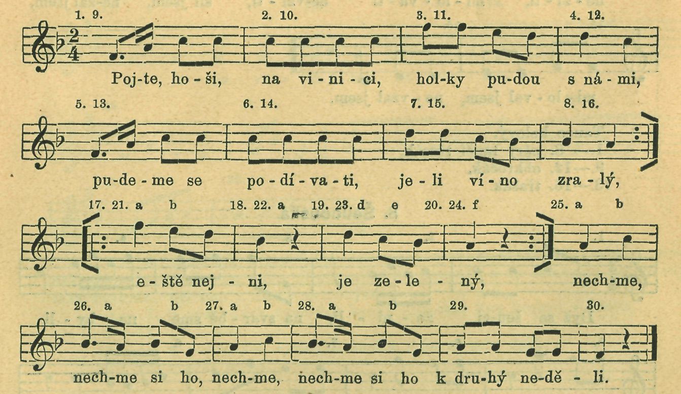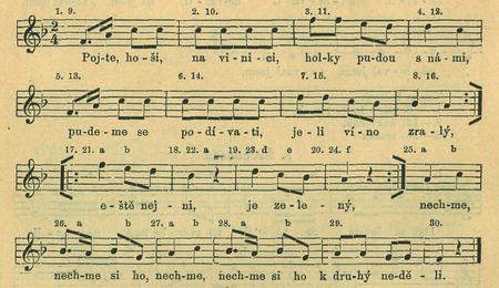 Někdy též tanečníci při tanci zpívají na 1.—4. takt: „Jednou, dvakrát, po třetí, po štvrtý se zatočí." Totéž opakují při 5.—8. taktu.