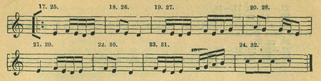 17.—18. tanečník vezme ve svou levici pravici tanečnice a plácne třikrát pravicí do její dlaně (a, b, c). — • -