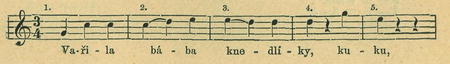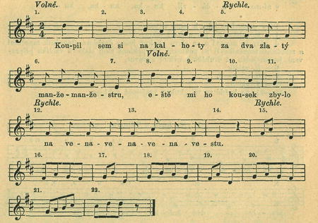 9. dva přísunné kroky v právo (opět ruce v bok). 10. dva přísunné kroky v levo. 11.—12. vezmou se za levé ruce a učiní zátočku na levo.