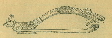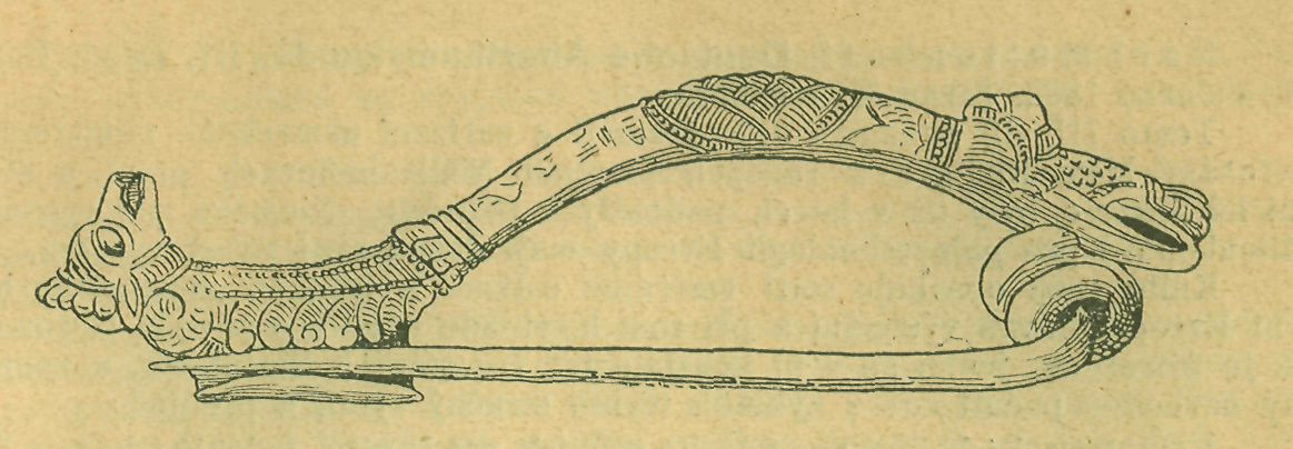 (jaká, nedozvěděl jsem se), pak narovnáno kamení a pod kamením opět hlína, ve kteréž nalezena sponka, kosti a lebky; jaké však, není známo. Tolik mi sděleno. Patrně byla tu kostra, nad kterouž nasypána mohyla. Sponka ta bohatě ornamentována, s ozdobou na oblouku v podobě síťoví, jakéž hojně se vyskytuje u sponek typu německého, mezi kteréž i lze tuto čítati. Stáří její možno, dokud více okolností není známo, odhadovati do poloviny I. tisíciletí po Kr.