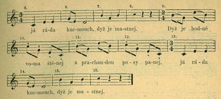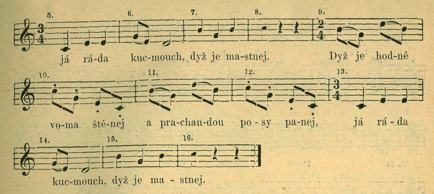 3.— 4. na každý z těchto taktů čtyři kroky obkročáku; tanečník počne levou, tanečnice pravou nohou.