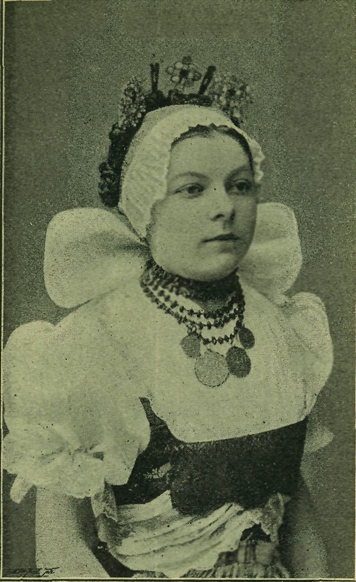 Ve všední dni a do práce panny vázaly si na hlavu šátky „na kačenku", „na bětušku", neb i „na telecinku", šátky to ne již pěkné a drahé karmazínové, nýbrž tisknuté, nejčastěji červené. Zdali k nim i do práce braly prosté vínky bílé, šité na způsob bílých čepců uzlíčkových, kterýchžto vínků jen málo se zachovalo, toho jsem se nemohla dověděti, čímž se stalo, že mi není rozřešeno, jsou-li tyto bílé vínky ozdobou na den všední, či ozdobou dívek chudých. 2)