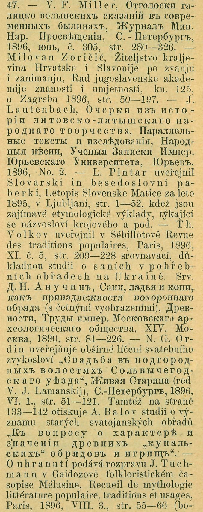 ricas (str. 189); K. Hahn. Heilige Wagen (str. 342). - Gustav Ban-calari, známý odborník ve studiu lidového stavitelství, uveřejňuje začátek důkladné práce «Forschungen und Studien über das Haus" (I. Rauchhaus Herd, Ofen, Rauchfang, Kamin), Mittheilungen der Anthropol. Gesellschaften Wien. 1896, III. str. 93-128. -Význam zajíce v .mythologii líčí E. Lefébouře ve folkloristickém časopise Mélusine, red. H. Gaidoz, Paris, 1696, VIII. 2., str. 25 a d. — Význam měsíce v lidových představách líčí Haas. Blätter für Pommersehe Volkskunde. Štětin, III. č. 10. — J. Wi-tort podává v Karlowiczově Wisle, Warszawa, 1886, č. 1., str. 12-33 důkladnou studii o manželství zjednávaném koupí (Ma)ženstwo przez kupno i powstanie posagu). V témž čísle str. 1—11 pokračuje S. Udzicla v článku Opowiadania ludowe ze S t areg o S acz a. Práci Ad. černého .o mythických bytostech Luži-ckých Srbů dále překládá Bron. Grabowski (str. 54—97, pokračování v č. 2. str. 245—281). Důležitá je stať Ad. Strzeleckého Materjaty do bibliografii ludoznawstwa po 1-skiego. kde v první části sestavil díla, rozpravy a články od r. 1878—1894 (str. 88 a d.). V č. 2. kromě jiného podává zajímavý příspěvek k dějinám hádanek polských H. L o p a c i ň s k i na strana 338 až 341, srovnávací studii o této pohádce polské: „Przyszcdt dobry do zlego a prosil u niego lepszego nižli królestwaNiebieskiego, a dal mu." — Důležitou studii o mythologii litev-ské (Die Balticades LibellusZasicki,Untersuchungen zur litauischen Mythologie) napsal Dr. Theodor E. von Grien-berger v Jagiéově Archivu für sla-vische Philologie, Berlin, 1896, strana 1—86. V témže svazku Ďr. A. Brück-ner píše o sbírkách slovanských přísloví, zejména o polské, znamenité knize Adalbeřgově (viz Č. Lid V. 90). Zmiňuje se také o příslovích staročeských. Právem doporučuje, aby se vyčerpaly po stránce příslovnické také památky staročeské. Upozorňuje mimo jiné na česká přísloví v rukopisech Jagiellonské bibliotheky v Krakově. Prof. Bruckner, jak jsme již v Č. Lidu často ukázali, pilně si všímá při
