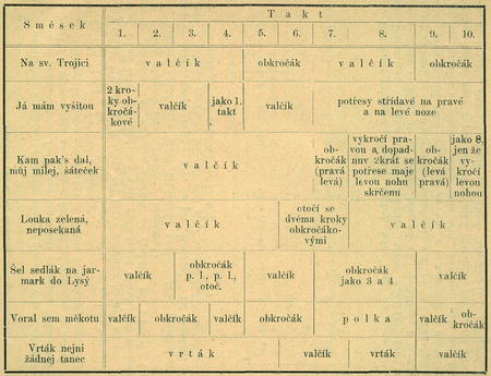 Při rozlišování tanců musí se přihlížet i k nápěvu i k postupu pohybů. Zvláště při „Směscích" musí se srovnávati nápěv, píseň a pohyb. Základní prvky pohybových postupů jsou tu stejné, ale jsou rozmanitě sdružovány a spojovány, jak vysvitne z těchto přehledů, v nichž srovnám od různých směaků deset prvých taktů.