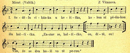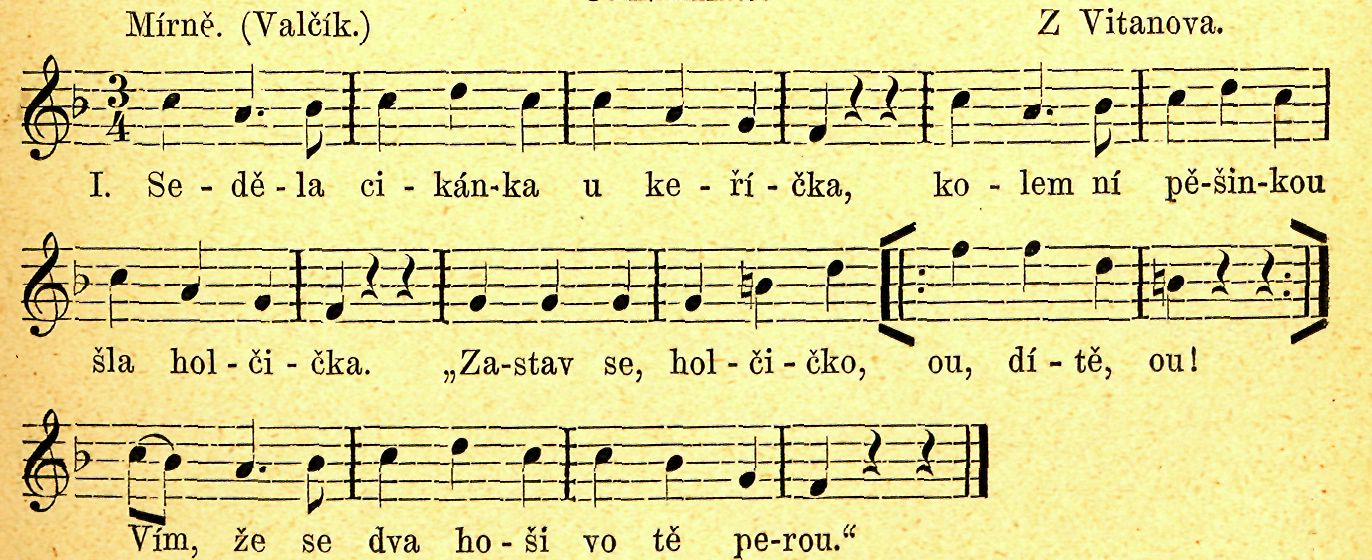 Tanečník s tanečnicí tančí, jednoduše se držíce, z původního místa (A) v (1.—2. a) takte tři drobné úkroky v levo s přísuny (do B). Při (2. b) ukročí tanečník z nového stanoviště (B) v levo dále (do C) a stanuv na levé noze, obrací se na ní čtvrtobratem a přenáší pravou nohu do nového místa (D), takže z dřívějšího směru se posunul v pravém úhlu. Pravou nohou (3.—4. a) ukročí:a k zemi dopadne, a postupuje třemi přísunovými drobnými kroky v právo (do E). (4. b) Při druhé čtvrti taktu, spočívaje na pravé noze, se otočí v pravém úhlu v levo v bok a levou nohu přenese v oblouku (do F). (5.—6. a) Ukročiv levou nohou a k zemi dopadnuv, postupuje třemi úkroky v levo (do H). (6. b) "Na levé noze se postaví. Přenášeje pravou nohu, otočí se v pravém úhlu čtvrtobratem v levo v bok a (7.-8. a) pravou nohou ukročiv a k zemi dopadnuv (v Ch), postupuje třemi kroky přísunovými v právo. (8. b) Pravou nohou ukročí (K), pak, přenášeje levou nohu, se současně otáčí. Levou nohou ukročí čtvrtobratem, otofie se o úhel pravý (do A) a tančí tanec znova. Tanečnice koná všechny tyto obraty opačnou nohou v opačnou stranu.