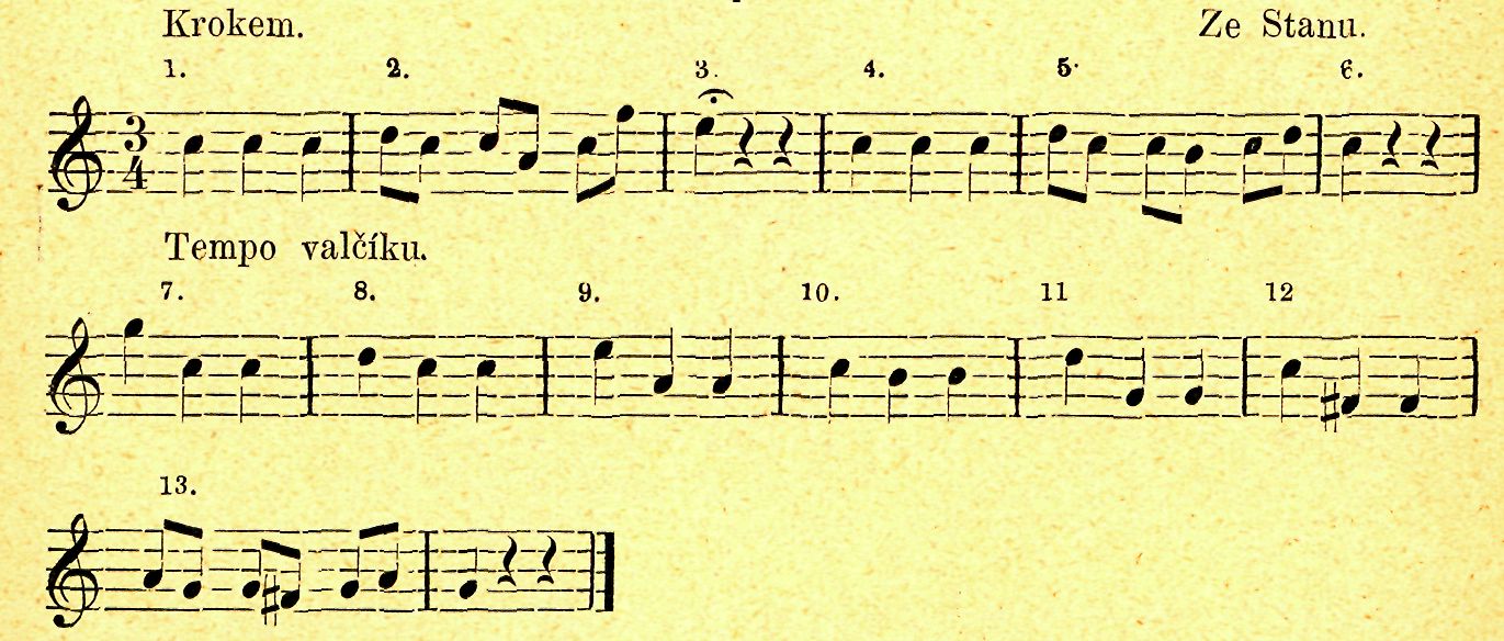 Tancují (ve Studnicích) v taktech (1.—2.) polku, v taktech (8.-4.» trojnásobně podupnou, a zase v taktech (5.—8.) polku, pak (9.—10.) jako ve 3.—4. taktu. Polka znova.