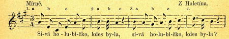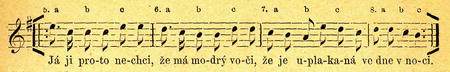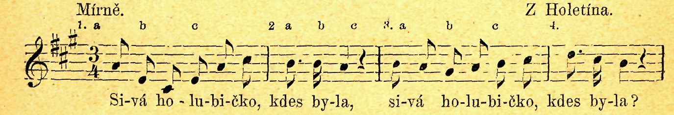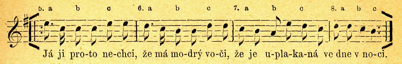 Tanečník svou pravicí vezme pravou ruku tanečnice a levicí levou ruku její. Kuce mají vzadu křížem, (la.) Tanečník i tanečnice vyrazí pravou nohou v před, takže dopadnou k zemi asi o krok do předu, Levé nohy se málo nadnesou, (lb.) Dopadnou levýma nohama k zemi a pravé nohy málo nadnesou, (lc.) Přenesou se pravé nohy o dva kroky ku předu, neboť původně byly pravé nohy v zadu o krok, k němuž ještě krok se připojí. Levé nohy se nadnesou na svém místě. (2a) Přejdou levýma nohama o krok zase ku předu, takže proti pravým nohám budou o dva kroky malé v před; pravé nohy se nadnesou. (2b.) Pravé nohy dopadnou na svá místa, levé se nadnesou. (2c.) Levé nohy dopadnou k zemi, pravé se nadnesou. (3a.) Přejdou pravýma nohama v před o malý krok oproti levým. (Má-li tančící pár dosti místa, mohou tančící přejít pravou nohou trochm stranou.'; Levé nohy se na svém místě nadnesou. (3b.) Levé nohy dopadnou k podlaze na svém místě a pravé nohy se nadnesou, (?c.) Přejdou pravýma nohama o dva malé kroky zpět, takže proti levé noze budou o jeden krok zpět. Levé nohy se nadzvednou. (4a.) Levýma nohama dopadnou tančící páry, otočivše se asi o pravý úhel na právo v před. (4b.) Přejdou pravýma nohama v před, otočivše se také o čtvrt kola v právo. (4c.) Přejdou levýma nohama v před, otočivše se zase o čtvrt kola. (5a.) Přejdou pravýma nohama v před, otočivše se zase o čtvrt kola, čímž se páry o celé kolo otočily. Dopadnou k zemi a postupují v (5.-8.) jako (1.—4.), načež v (8c.) se otočí.