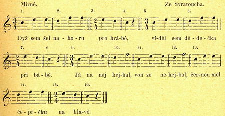 Tanečník postaví se (čelně) na levou stranu své tanečnice a vezme se s ní v zadu za ruce křížem. Při takte (la.) vykročí levýma nohama v před a dopadnou, pravé nohy v zadu pozvednou, v další čtvrti taktu (1. b) pozvednou levé nohy a pravýma nohama dopadnou. (1. c) Přejdou levou nohou v zad, pravou v před, a pak v taktu (2. a) dopadnou pravýma nohama, levé v zadu pozvednou, a pak (2. b) pozvednou pravé nohy a levýma dopadnou. V pomlčce (2. c) přejdou pravou nohou v zad, levou v před a (3. a) dopadnou levýma nohama a tančí dále vždy stejně po dvou taktech, takže (3.-4.) jako (l.—á.), (0.—6.) jako (1.—2.), (7.-8.) jako (1.—2.). (9) Otočí se při slově „ztratila" a tančí od repetice čelem v opačnou stranu, při (14.) opět se otočí při slově „ztratila".