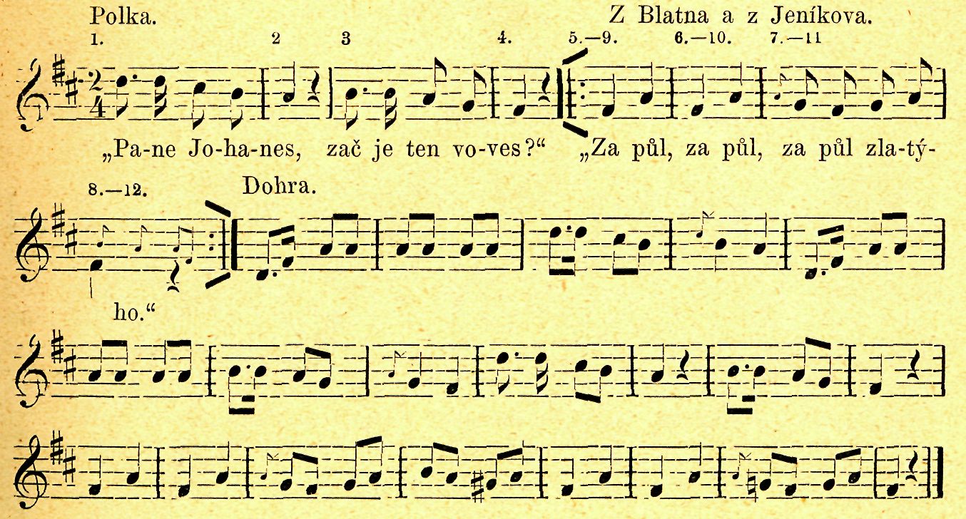 Pane Johanes, vo půl zlatýlio, [: že netrefíš do vsi Blatnýho.:] [: Amen, amen, do vsi Blatnýho.:]