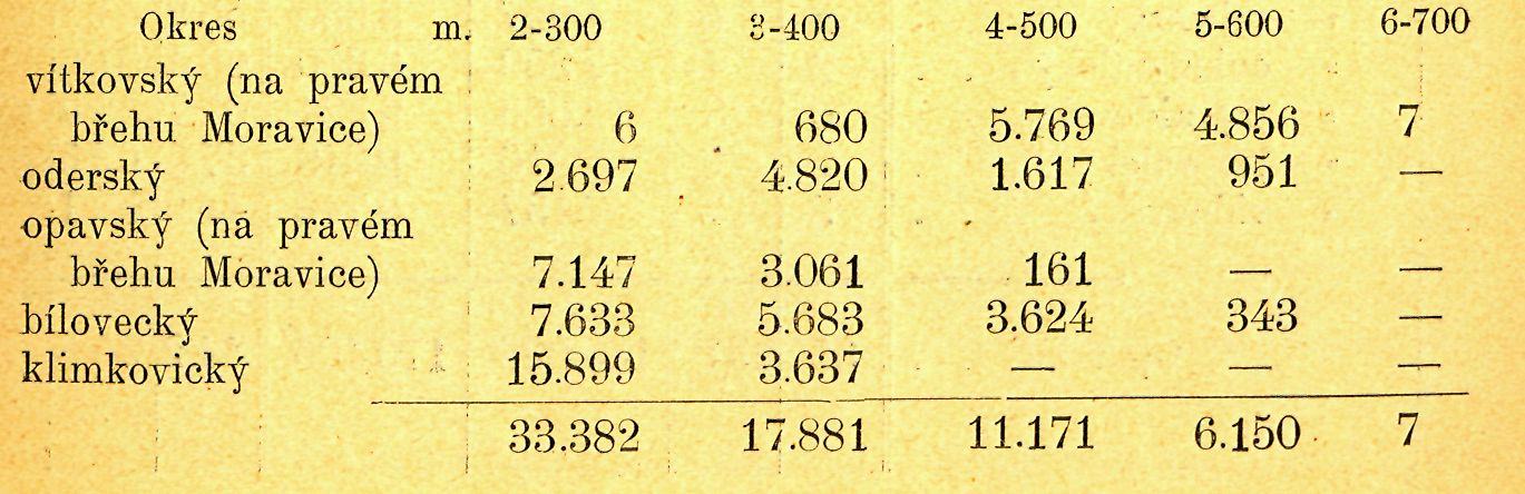 Planina Hrabyňská, áž na polovinu okresu bíloveckého a 3 obce okresu klimkovického Cechy obydlená, zabírá okres opavský po pravé straně Moravice a okresy klimkovický a bílovecký. Jsouc pokryta všude lössem vyniká svojí úrodností. V údolích neupravené Opavy i Odry časté povodně způsobují rolníkovi škody dosti značné. Přece však jsou údolí tato hustě zalidněna, neboť hlavně zde soustřeďuje se průmysl cukrovarský. Továrny na sukno a tkalcovny soustřeďují se v německém Bílovci i jeho okolí. Na Klimkovicku je průmysl slabý, za to však přebývá tu mnoho dělnictva, pracujícího v uhelné pánvi ostravské, což k lidnatosti okresu nemálo přispívá. Obývá tu 110 ob. na 1 km2, kdežto Bílovecko, ovšem více zalesněné, má jen 100 a venkovská část okresu opavského 97 ob. na 1 km". V těchto obcích okresu opavského přibývá obyvatelstva měrou skrovnou. Za to kvapně vzrůstá Klimkovicko, město i venkov (+ 10%)i na což ovšem průmysl a uhelny ostravské mají nemalý vliv. Za to městu Bílovci, ač průmyslnému, přibylo obyvatelstva jen o 2.5%, venkovským obcím okresu dokonce něco ubylo (— 10%)).
