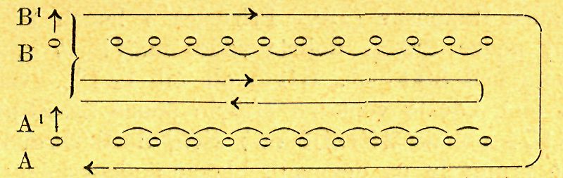 Krajní tanečník přibližuje se (z A do A') k protější tanečnici tancem dle hudby. Tanečnice tato ustoupí o malý krok (z B do B1). Pak se oba vezmou za ruce tak, že tanečník levicí drží pravici tanečnice. Oba stojí k sobě bočně, zdvihnou paže v oblouk nad hlavy tanečnic a krátkými valčíkovými kroky přetančí řadu tanečnic a pak řadu tanečníků.