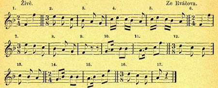 (2.—5.) Tančí se valčík, jejž začíná tanečník šoupavým sunem pravé nohy k levé noze. (6.) — (1.) (7.—9.) zase valčík. (10.) Oba tančící ukročí levou nohou, majíce pravé nohy skrčeny, a třikráte potřesou na nich, pak (11.) totéž opětuje se pravou nohou. (12.—13.) valčík. (14.—15.) -= (10.—11) (16.—17.) valčík. Tanec se opakuje.