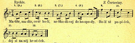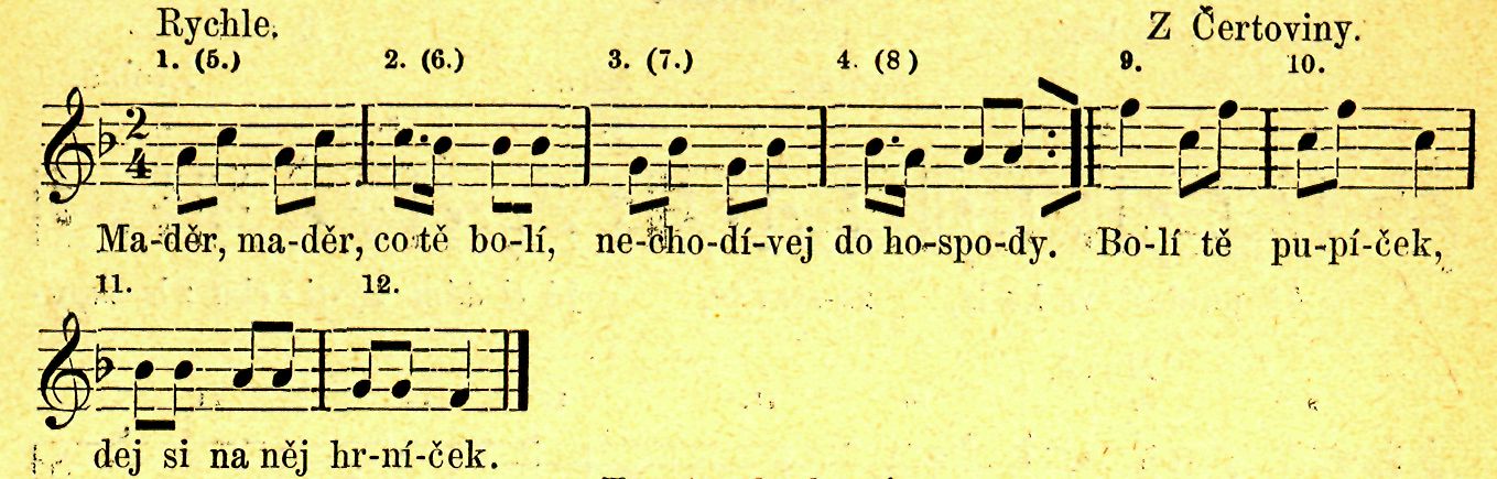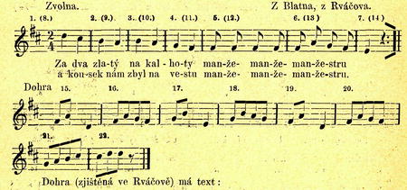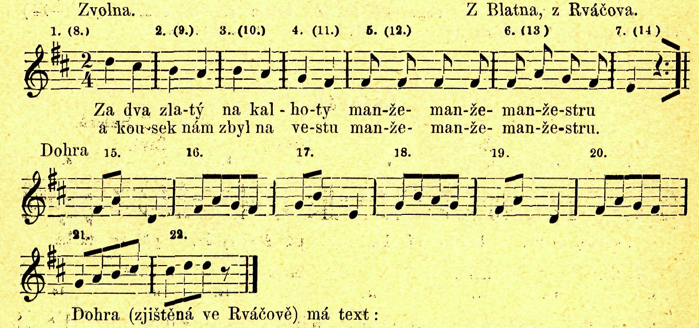 Dvojice, jsouce připraveny do kola, tančí (1.—4.) na místě čtyři lioupavé kroky ..(ne, stoje, rozkročného), takže na jeden takt jest jeden krok, pak (5.—7.) PSt posunných rychlých kroků (úkrokň) v právo, tak aby na jednu čtvrt připadl jěděh krok. (8.—11) = (1.—4). (12.—H.fpět posunných rychlých kroků (úkroků) v levo, (15.—22.) polka.