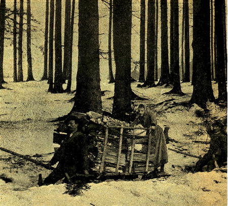Jsou tu ovšem zatím jen práce zimuí. Ta nejhlavnější — svážení. Dření ohromné, často nadlidské, ale ještě výnosné a dřevař náš říká: „Pro krk zase krk!" Při práci této ať jde s vrchu, ať do kopce, ať zastavuje, nakládá — při všem zdá se vám dřevař mužem železným, nezdolným. Zač „veme", musí povoliti, ať zvedá, tlačí, táhne . . . Ale ptejte se ho po čase, a řekne vám sám, že z toho dření nechce se tělo vzpamatovat do sv. Jakuba. (Vyobr. č. 1., 2., 3., 4.).