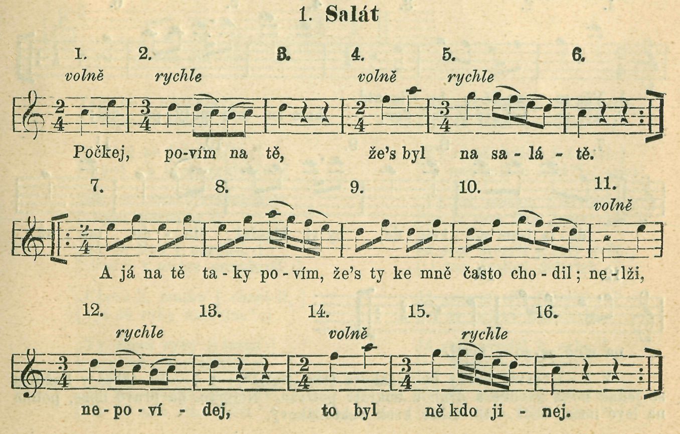 Koumej, co ti budu házet! Koumáš? Koumám ! V tom kremzlíku nás štípli a vlekli do kamena. V kameně nás po-šťárali a pak nás skopec zamachloval. Navalují nám zobec, kříšťalku a jinou baštu ; místo báchory chlupačka; šábes, smole a smoláky. Vlíkáme furt k vrcha-noj (hlaváčoj), beranoj a řezáčoj. Řezáče beraníme o štípák a stinky atd Mám plašáka; ten neléák bude práskat. Já házel vrchauoj, že toho samotného nekoumám. Hod tomu samotnému, že nesmí prásknout; sic je veta, Lh'-ta na holísku! Naval mně šustlavej; já musím vorat jamboře. Bez ! Skopec vlíká po kameně. Ne pu! Budeš hákovat! Hoď jamboře, ať navalí zobce, že míhám fába, sic že na ni prá. — Jambora navalí šecko, máš se dr — !