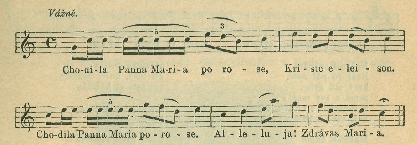 Kam, Maria, kam kráčíš? atd. Kráčím do Ěíma na pouť atd. — Jak Maria práh překročila atd. — Krásnýho syna porodila atd. — Plínčičkama ob-