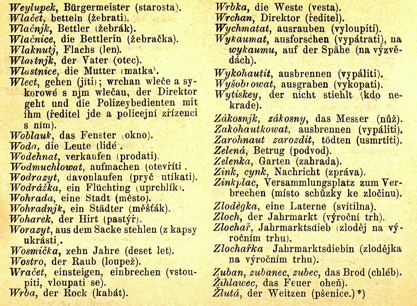 *) Několik slov převzatých z německé a židovsko-německé zlodějštiny: „Aisch, der Mann. — Aischin, das Weib. — Bausen sich fürchten. — Buser, das Fleiisch. — Egele, der Wagen. — Enaien, die Augen. — Flopen, der Keise-pass. — Geschiebes macheD, davon laufen — Gisar, das Dorf. — Handeln, stehlen — Hargen, sich ärgern — ChapeD, thapern, ganaffen, stehlen. — Chaser, das Schwein. — Jajem, der Wein. — Jaske, die Kirche — Kaporn, sterben. — Keim, ein Jude. — Masern verrathen. — Meistern, Jemanden binden. — Mes seyn, todt seyn. — Miesig, das Rad. — Milch, der Salz. — Masamaten saszern, Diebstähle ausspähen — Moos, Geld — Piller, der Hund — Pasen, verkaufen. — Eiegel, Füsse. — Saszern, ausspähen. — Schaufert, Kerkermeister — Scheigatzel, ein Knabe — Schechel, der Versland. — Scheucher, das Bier. — Scheukek, eine Lüge. — Schidler, besoffen. — Schiebes machen, entweichen. — Schnsosen, plaudern. — Spiser, Wirtb. — Veischüppet amtieren. — Warm, das Zimmer. — Weiches, das Gold."