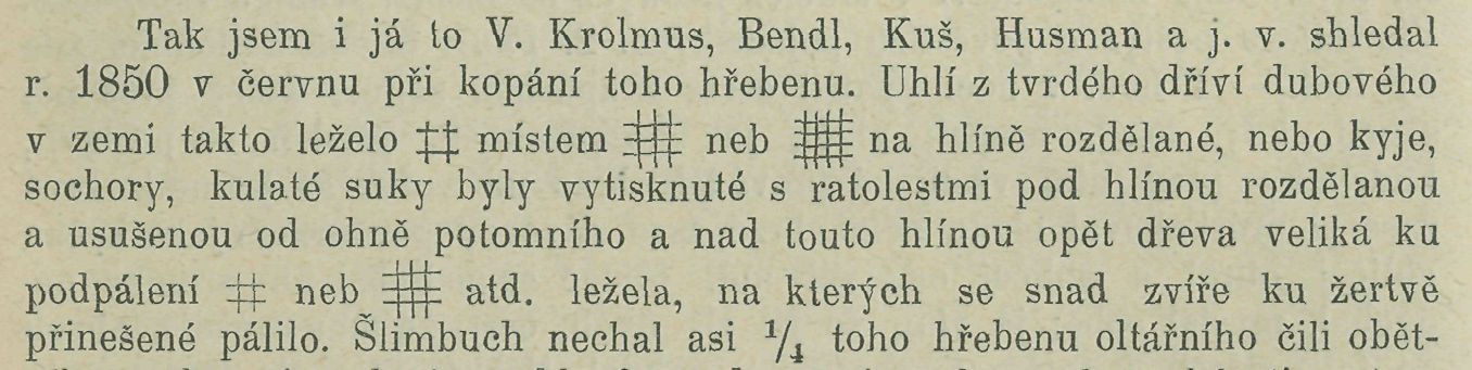 západu. Václav Vágner dí: když před 50 lety okolo 1800 p. Šlimbuch dolejší dvůr čísl. d. 12. koupil (který ho p. Jak. Osbornovi Doktoru lékařství a chyrur. prodal), on nechal oltář (hřeben nanošený) rozkopati, nalezl na hoře povrchu hlínu zemi obyčejnou, jak se zde nalézá na 1ji lokte, potom červenou hlínu červinku pálenou jako cihlu opět na 1/i lokte tlusté, pod touto červinkou samý popel dřevěný místem na loket tlustě ho leželo, pod ním červinka a opět hlína obyčejná, ale musela býti rozdělána na-polopalená neb se v kusech jako kámen láme, na '/a lokte tloušky, pod ní tvrdá země nehýbaná a pod ní skála. V popeli se nalézají rozličné kosti zvířat přežvykujících. volů, býků, buvolů, zubrů, jelenů, kanců, vepřů, kozlů, beranů, též koňů, rozličných dravých ptáků velkých,, havětě mezi nimi něco střepů z popelnic atd.
