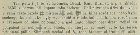 mho rozkopati a do jam sklepu, studně, nejprv kamením zahazeti, potom hlínou zavříti a povrch popelem zasypati; napřed nechal v prvním oddělení kopati, aby věděl, co se tam nalézá, na sklepy, kvelby a rozličná sklepem' přišel, rozličných nádob, karhanů, kamenů zde nalezl, mnoho cedníků, hliněných nádob, kotlů, hrnců, klínů hromových, mlatů a j. v. potřeb. Hynek nebožtík vorač a jiný dí: Když zde Verfel kočí před lety voral, kůň se mu probořil, šťastně nohu mu vytáhli, díru do sklepem' větší otevřeli, s opratí dlouhou svázali, naň psíka uvázali a dolu jej pustili. On se jim dole utrhl a 3 dni díru nechali otevřenou, on tam sem tam běhal, slyšíce ho po 3 dní štěkati, potom umlkl a díra se zaházela.