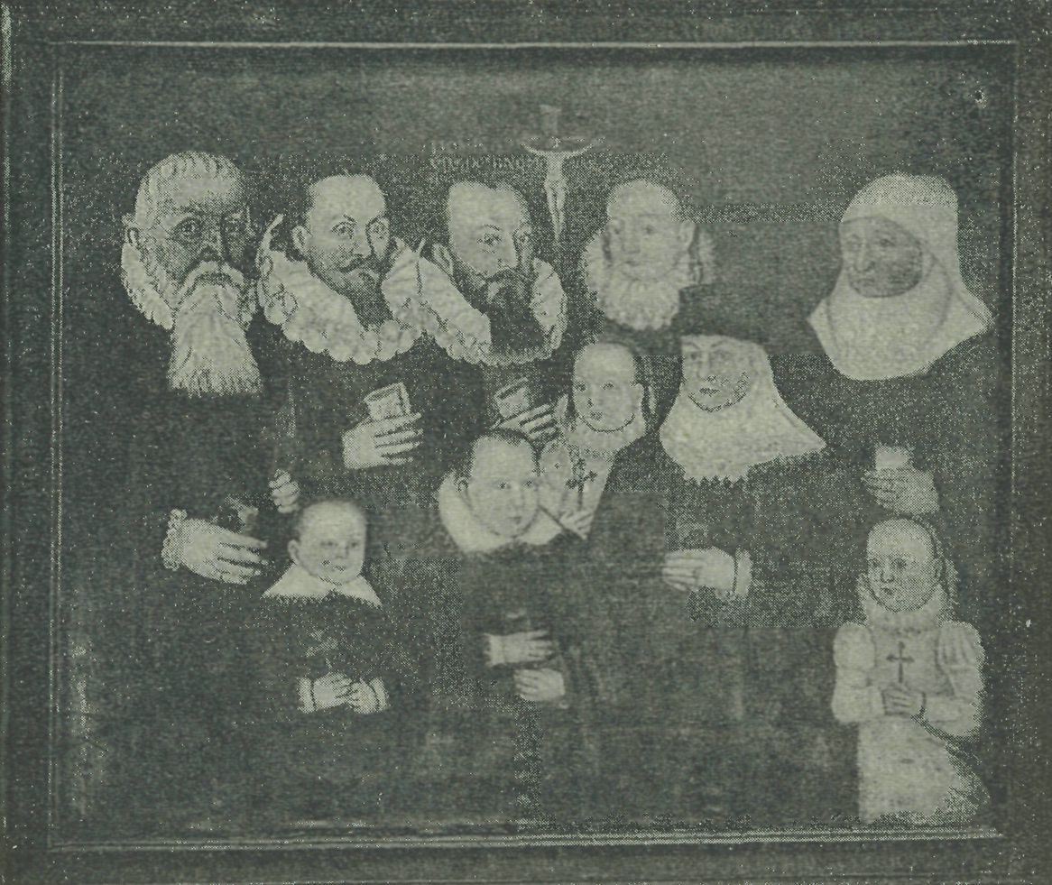 * Hodina Mostníků s Ništice v Berouně. Pěknou představu o ze-vnějšku a kroji zámožné rodiny české na začátku XVII. stol. za Rudolfa II. podává obraz tak zvaný Mostníkovský na severní gallerii děkanského kostela v Berouně. Píše o něm prof. Jos. Vávra, Paměti král. m. Berouna, str. 121: »Představuje stařičkého Sixta Mostníka se ženou Ludmilou, oba jeho syny, s manželkami a dětmi; kolem jest nápis: L. P. 1609 v sobotu po sv. Janu Křtiteli, t. j. 25. června, mezi 17. a 18. hodinou, slovutný