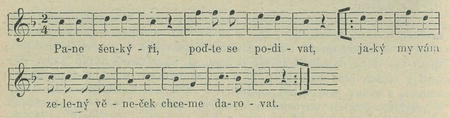 1. Šly sme vokolo pancky zahrady [: byly tam růže krásně červeny (nebo jak malovaný.) :] — 2. My sme se ptaly, kde je zahradník [: aby nám dovolil jednu růži vzít. :] — 3. Jednu růži vzít, věneček uvít [: abysme mohly svoje panenství krásně ozdobit. :] (Kozlov.)