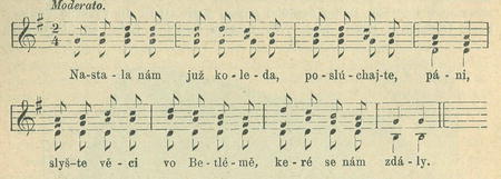 2. Porodila panna synka v městě Betlehémě, vložila ho do jesliček, vesele mu pějme. — 3. Zahrál Simko na husličky, Barbor na barborku, Honza s Jurkou za jaslama zpívali pěsničku. — 4. Mikuláš se na to zlobil, že ho brzy zbudil, praštil po něm kolevratem, krky mu vykrútil. — 5. Již se všichni ovčáčkové do Betléma sešli, naposledy starý Petr ten zůstal u cesty. — 6. Běží Petr po dolině, halenku na pleci, ohledá se na vše strany, neběža-li vlci. — 7. Viděl on tam "vlčka v poli, jak ovečku žere, svatý Petr karabáčem přes záda ho pere. — 8. Ztratila Maria čepec, zůstal jí na cestě; chtěla Bětka vobědovat, zavřeli ji v městě.