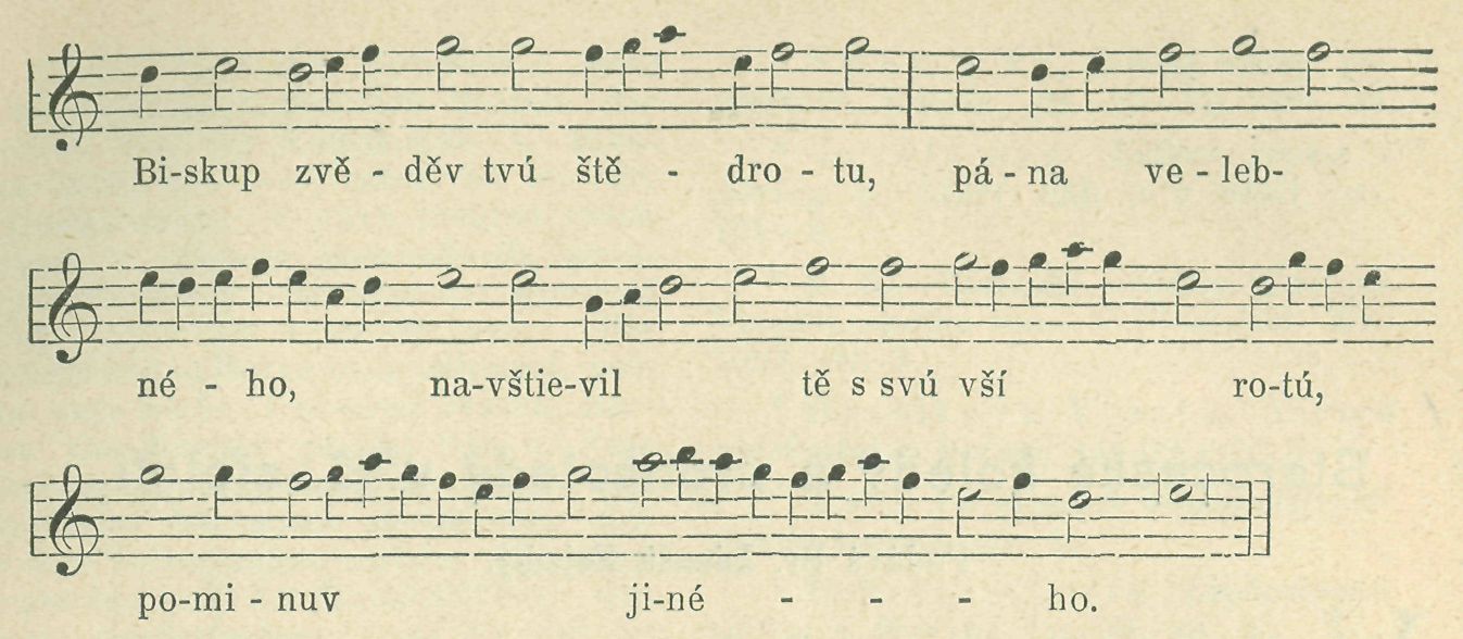 Tento nápěv jest jen druhá polovice (s malými změnami) celého nápěvu, jejž jsme podali z husitského kancionálu Jisté b-n i c k é h o. První polovice (versus) odpadla, text se zpívá všechen podle druhé části (repeticio), takže v jedné sloce se nápěv vždy opakuje. Co jsme řekli o upravování nápěvů, potvrzuje se velmi dobře tímto rukopisem. Byl-li zpěvák slabý v latině, dopadla deklamaee tak hrozně, jako v tomto zápisu od slov »quem et benedicimus«. Text v tomto rukopise má jen 4 sloky.