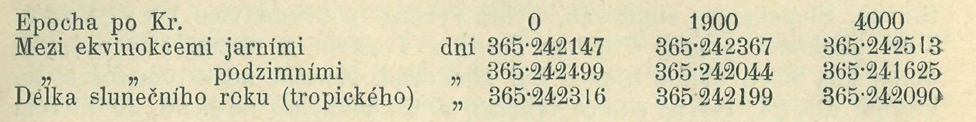 Dle sdělení, jež učinil slavný americký astronom Simon Newcomb panu Mendělejevovi roku 1900, obnáší interval mezi dvěma návraty k ekvinokciu pro různé epochy následující počet dní: