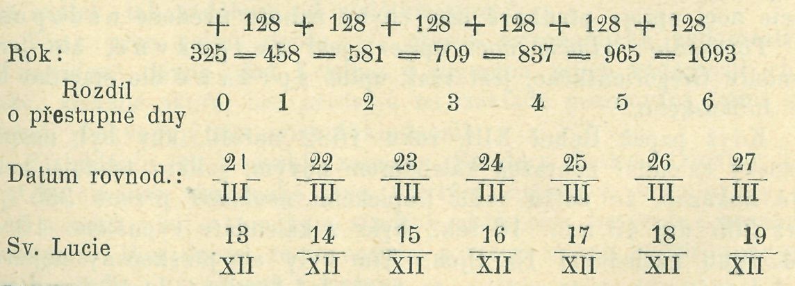 Difference mezi délkou roku Julianskébo, který předpokládal Julius Caesar rovným 365"25 dnům a mezi nynějším slunečním rokem obnáší 0 007801 dne čili l/lslS.i8S7 dne. Musí se tedy vždy za 128-1887 let jeden přestupný den vypustiti. Kdybychom se však chtěli vrátiti vždy k jarní rovnodennosti, jak to chtěl papež Řehoř X., bylo by uvedené číslo 13101. Je známo, že dle Řehoře vypouštíme 3 přestupné roky za 400 let, čímž vlastně užíváme nesprávného čísla 133"33 . . let.*) Dle téhož papeže muselo roku 1583 přijíti jarní ekvinokcium na 21. března, jak bylo tomu za doby velkého koncilu Nicejského r. 325.