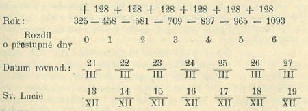 Máme tedy celou věc vyjádřenou následujícím přehledem, když od doby prvního koncilu Nicejského v roce 325 za každých okrouhle 128 let rozdíl mezi Julianským a Gregorianským kalendářem se posune a 1 den,, tím, že se v druhém kalendáři vždy jeden přestupní den^jvypťfchá.