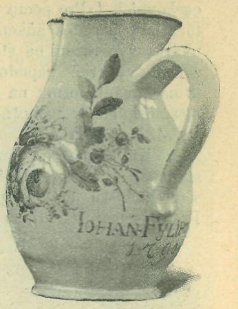 Holičský džbánek z r. 1790 (nápis: Johann Filipovicz). Majetek uměl.-prům. musea v Pešti.