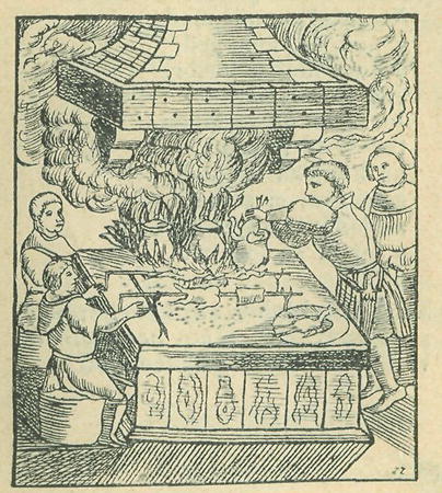Staročeské knížky kuchařské mívají na titulním listě rozmanitá vyobrazení kuchařské práce. Obrázek na str. 328 krášlí titulní list Kuchařské knihy Bavora Rodovského z Hustiřan, vydané r. 1596. Podává jasnou představu, jak byla upravena kuchyně staročeská ve druhé polovici věku XVI., jak kuchmistr i kuchtíci připravovali krmiěky labužníkům tehdejším. Všímáme si zvláště rožňů, jimiž kuchtíci točí. Úprava jejich shoduje se úplně s popisem kuchyňského nářadí téhož, jak je popsal i zobrazil assistent V. Fabián v Českém Lidu na základě sbírek Musea království Českého.