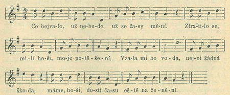 Chtělo se jí vína píti, neměl jí kdo pro něj jíti. Běž, mužíčku, běž pro něj sám a přines mi ho plnej žbán. Hned mužiček všeho nechal, do sklepa pro víno spěchal, do sklepa hned pro něj šel. Už byla plná konvice, hned pospíchal do sednice. do sednice jí ho nes. Ženuško moje rozmilá, či sou botky se špornama? Sevci na jarmark přijeli, ty boty tu zapomněli, ty boty tu nechali. Ženuško moje rozmilá, či je kabát se šňůrama, či je kabát s šňůrama? Krejčí tady dneska jeli, ty ten kabát zapomněli, kabát tady nechali.
