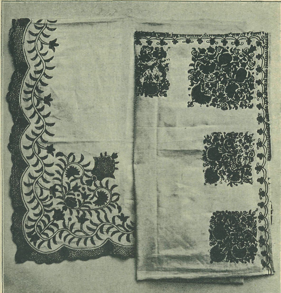 k vázání; tkaniee po koncích límce do oblouku přišité měly ten úkol, aby fěrtoch na krátké šněrovačce udržely. Fěrtochy ty jsou vesměs po okraji lemovány vyšitými obloučky, nad obloučky ozdobeny vyšitým pruhem a po ploše kvítky do řad stavěnými. Fěrtoch A na vyobrazení tom má nad vyobloučenou obrubou vlnovku s lístky a drobnými kvítky, jejíž jednoduchost vyvážena jest rozmanitostí květů, po ploše fěrtochu rozesetých.