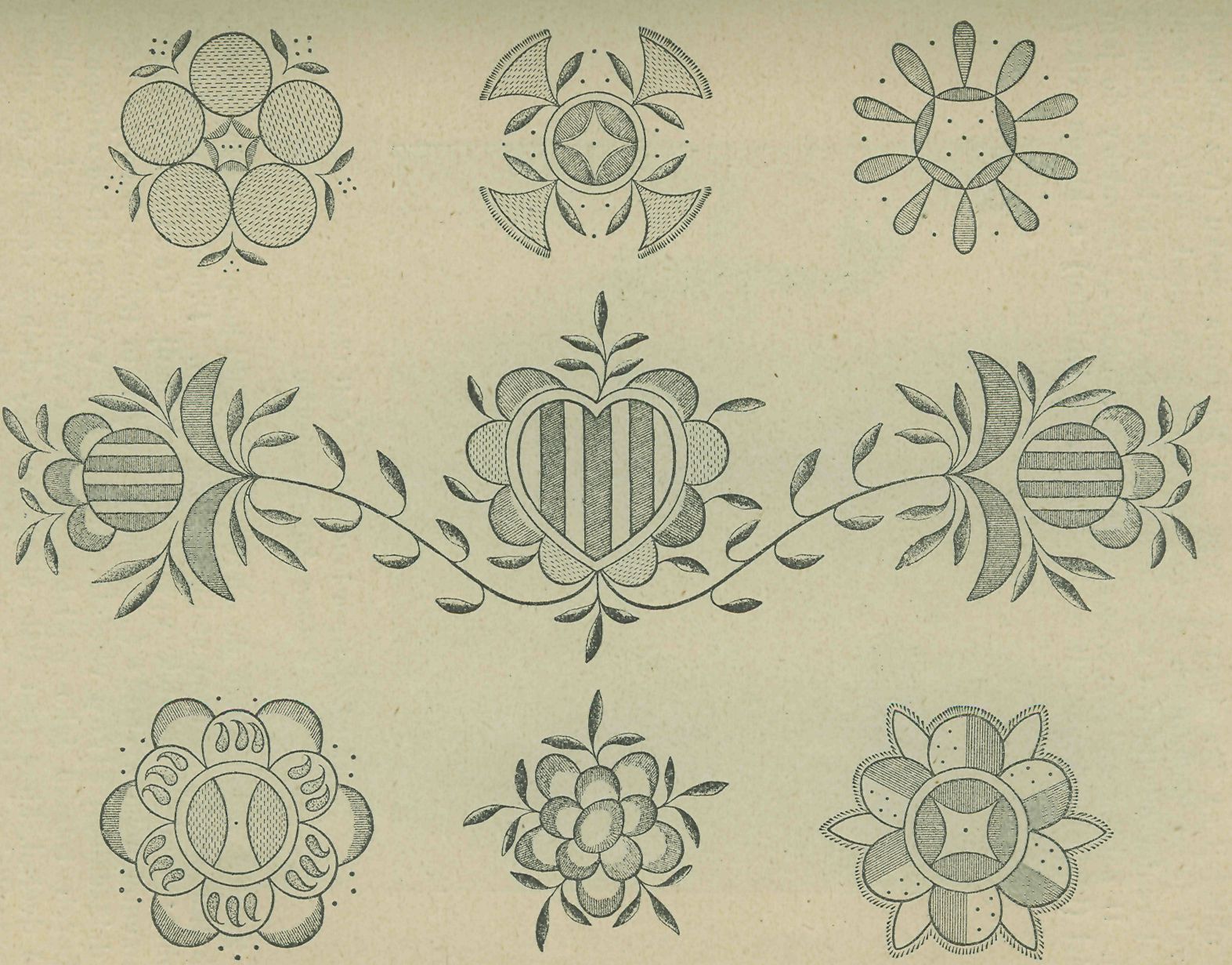 »katřičky« ä jour) s tkanicemi až půl lokte širokými, rovněž bohatě vyšívanými, nebo jednoduché kartounové, modré.