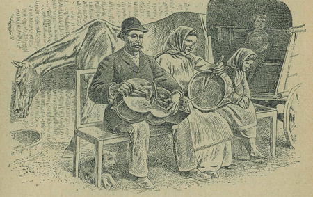 .Komediant svolává niněrou (kolovratem) na komedii. Kresba Sal. sv. pána Friedberga-Mírohorského.