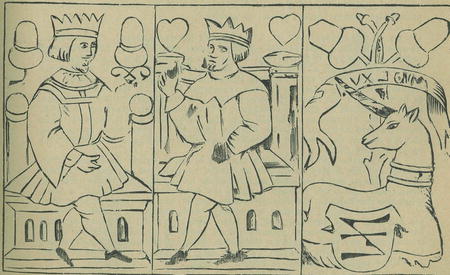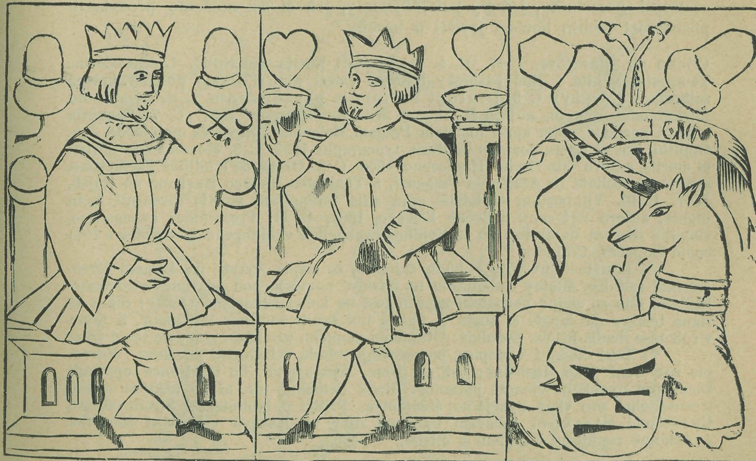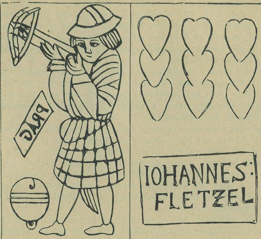 Č. 4—5. Karty nalezené v Černé věži na Hradě Pražském. Podle originálu kreslil A. Gareis a Fr. Chalupa.